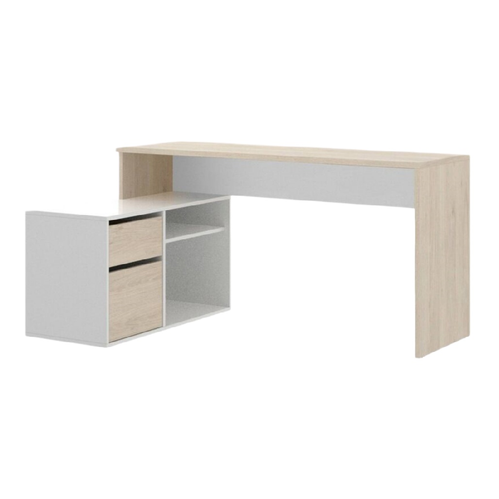 • Bureau moderne avec rangement intégré en bois clair et blanc.