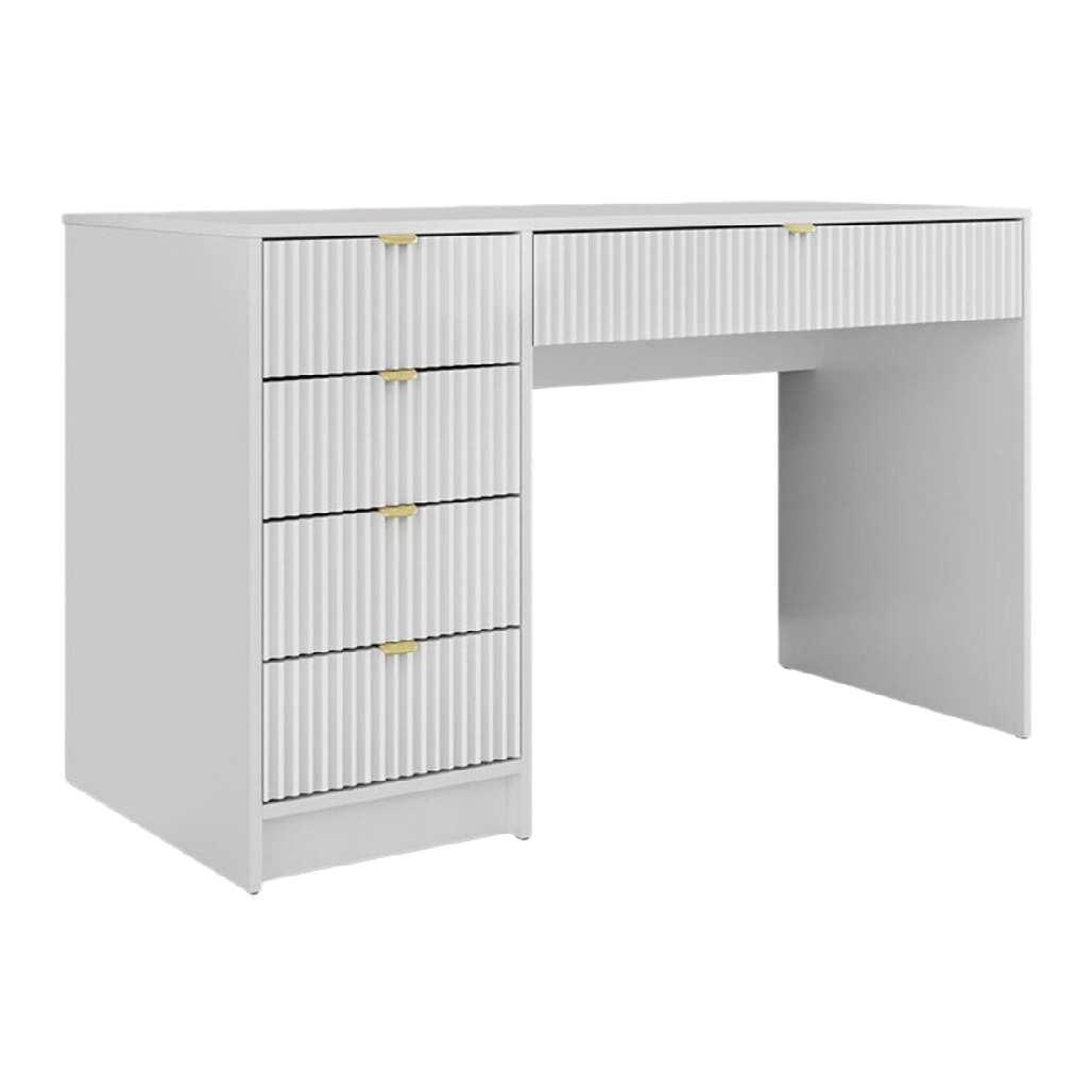 Bureau moderne en bois avec tiroirs à motifs en relief, finition blanche et poignées dorées.