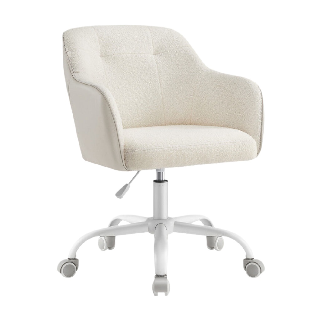 Chaise de bureau pivotante en tissu blanc avec accoudoirs et base en plastique blanc.