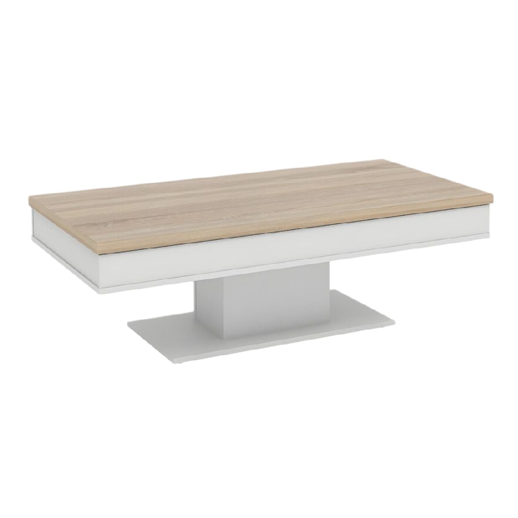Table basse moderne en bois clair et base blanche.