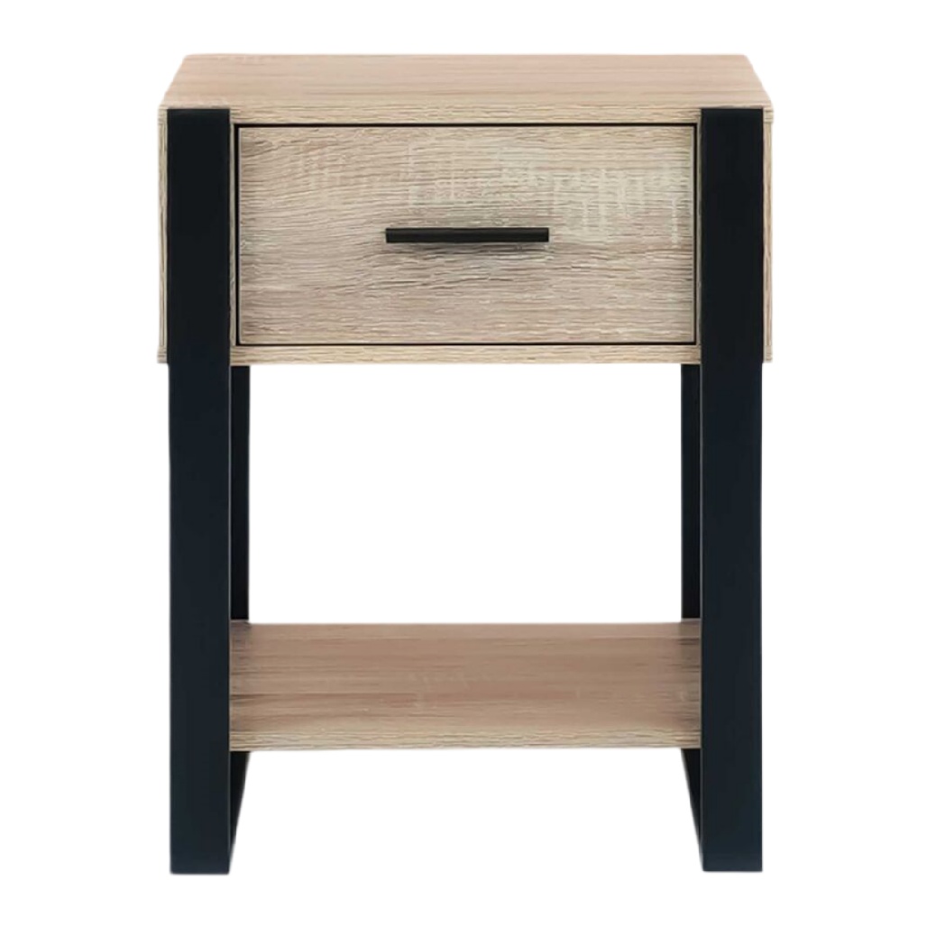 Table de nuit en bois clair avec tiroir et étagère inférieure en métal noir
